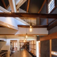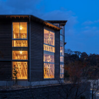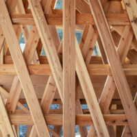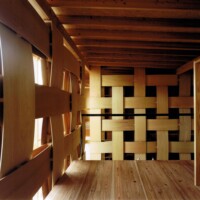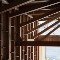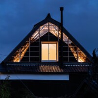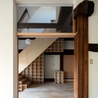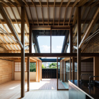 杉の家―敷地は町全体が緩やかに南へ傾斜する見晴らしの良い素晴らしい住宅地の一角に位置します。新しい試みとして、周辺と敷地とを塀や柵で区切る事を止め高低差だけを境界とした上で、緩やかな斜路により周辺と敷地内とをあいまいに繋いでいます。周辺から敷地内に入り込んだ斜路はそのまま中2階のデッキテラスに接続するスロープへとつながり、道路の高低差を利用した重層的な床レベルや内外を複雑に行き来する回遊動線とあいまって、建物の中だけではなく、豊かな周辺環境全体の中に住んでいるような心地よい開放感があります。同時に書斎や寝室、和室といった落ち着きのある、とどまる場所を内包したコの字型のボリュームを東西に配し、開放性のカウンターウエイトとして機能させています。1対のとどまる場所は、外から室内に入りこんだ焼きスギ板の大きな壁面と、部屋の他の柔らかい仕上げに対して非常に荒々しい表情を持つ土壁の大きな壁面により、より強調されています。「1対」というデザインは必然だったように思います。東西に設置された1対の巴瓦は、2人のお子さんが作成されたものです。この建物は接着剤や合板を一切利用せずに、大きな気積の在来木造住宅を実現しています。自然素材の木造住宅といえど、現実には合板や接着剤に大きく頼っています。裏方が変われば表面のデザインにも変化が生じ、従来の木造住宅には見られない、新しい建築表現になったのではないかと思います。厚板の斜め張りや、貫壁など伝統工法を織り交ぜ、無垢材だけで構造上の解決を試みています。更にあらゆる2次部材を30mmをモジュールとして、木組みやビス止めで組み上げており、将来的な再利用やリノベーションに対応しています。建物内外から魅力的な見え方をしている長大な薪小屋が示すとおり、薪ストーブは設計にあたっての最重要項目の1つでありました。冬の暖房は基本的にはストーブによる全館暖房です。階段室下のニッチから横方向に出てきた暖気は吹き抜けを上昇、吹き抜けに面して設置された巨大なガラス面により、上部で冷やされた空気が下降し、対流を生み出します。更にストーブ上部の分厚い土壁に蓄熱を期待しています。夏季は深い庇による日射の制御と、詳細に検討された通風計画により快適な環境を生み出します。